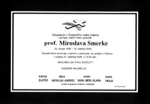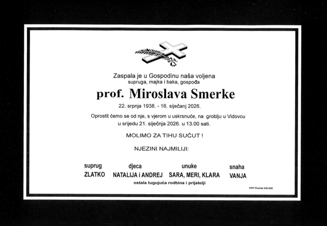S dubokom tugom obavještavamo Vas da nas je napustila naša draga profesorica Mira Smerke, istaknuta kulturna djelatnica i neumorna čuvarica baštine Općine Vidovec.