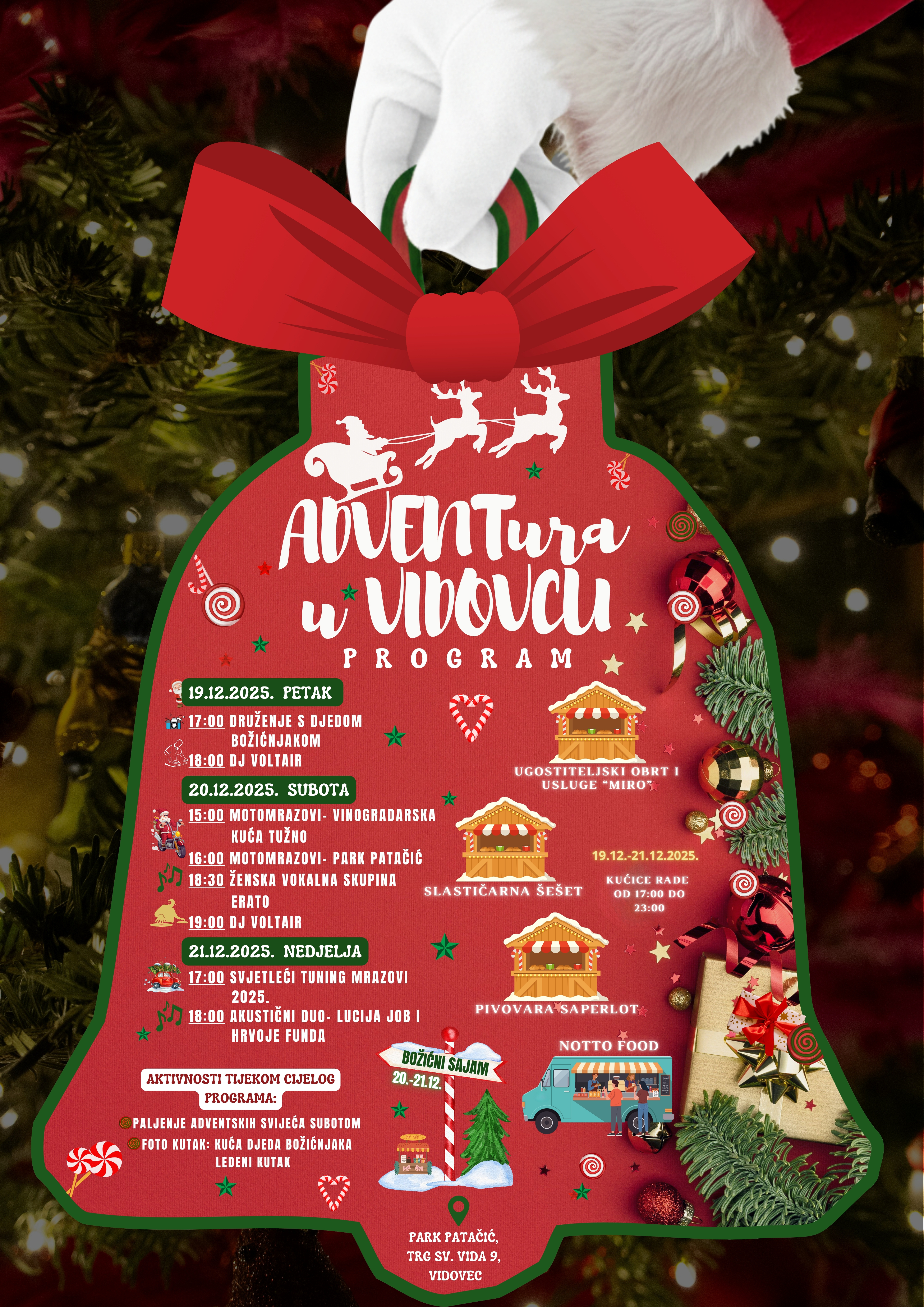 I ove godine smo Park Patačić pripremili za nezaboravan adventski ugođaj – ADVENTuru 2025., trodnevni program koji će od 19. do 21. prosinca pretvoriti središte općine u mjesto druženja, glazbe, tradicije i mirisa nadolazećih blagdana.