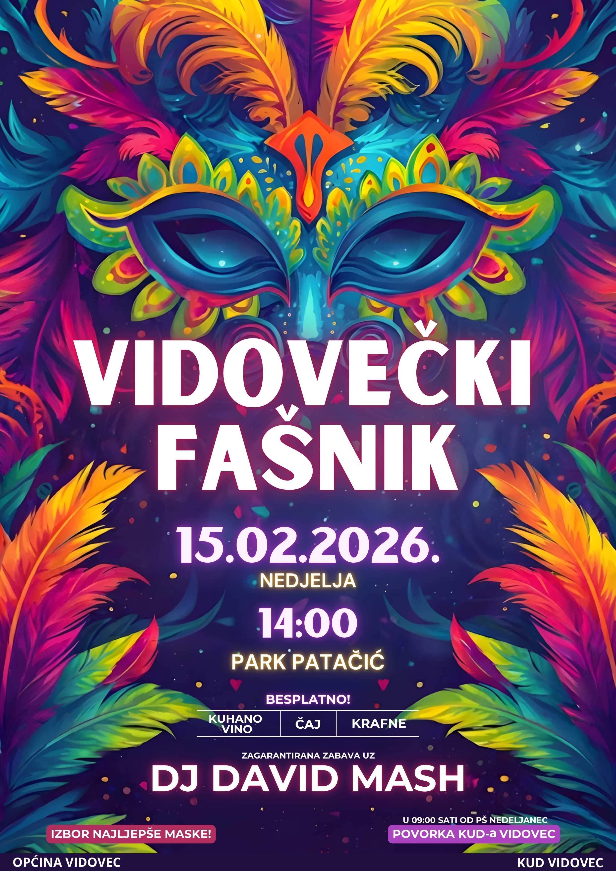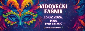 Općina Vidovec i KUD Vidovec pozivaju Vas na najveseliji dan u godini, Vidovečki fašnik, koji će se održati u nedjelju, 15. veljače 2026., s početkom u 14:00 sati u Parku Patačić (Trg sv. Vida 9).